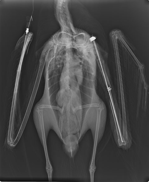 状態が回復してきたので、骨折部の整復手術を行いました。離断部をつなぐことはできましたが、骨片が大きく消失していたため、正常な骨の長さ通りに癒合してくれるかは難しいところです。コアホウドリを含むアホウドリ類は、鳥の中でもかなりの長距離移動を行う種です。骨同士がついたとしても野外で生きていけるほど飛翔能力が戻るかはわかりません。今は骨折部位が癒合してくれるのを待つばかりです。