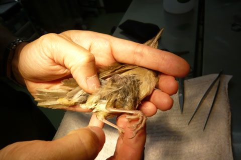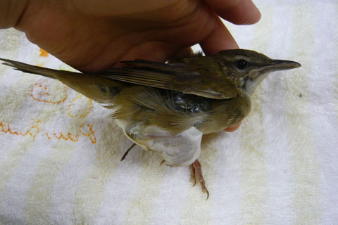 7月20日の20時頃、別海町上春別の道路を車で移動中に中央線上に丸い影を発見!Uターンして戻ってみたところ、エゾセンニュウが飛べずにうずくまっていました。顔つきはしっかりしており、出血や羽毛の汚れなど目立った外傷は見られませんでしたが、右足に力が入らず骨折しているようでした。