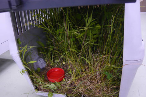 次の日センターに来てみると、入れておいたミルワームを完食!個体の状態も良好でした。しかしケージ内で激しく飛び回ってしまい、安静を保つのが困難な状況でした。そこで本来の生息環境に近い、身を隠せるような環境をケージを内に作り移動しました。