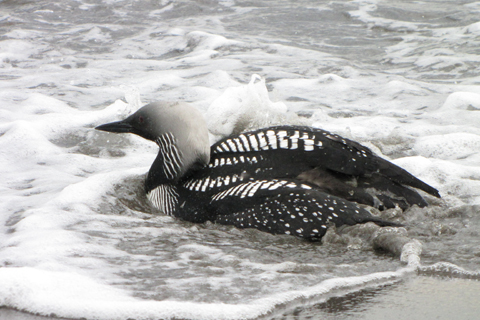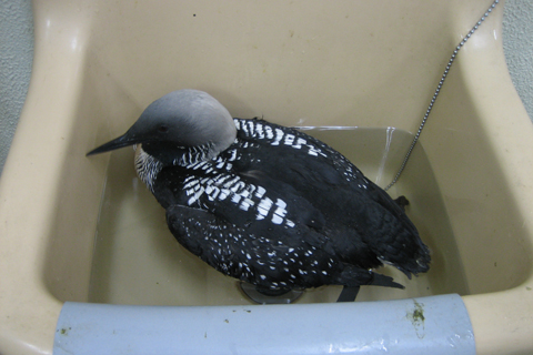 ゴールデンウィークのある日、釧路市でシロエリオオハムが保護されました。以前同じ種が猛禽類医学研究所で保護されたことがありますが、陸上で見かけるのはとても珍しい鳥です。車に少し引きずられたようで爪からの出血がありましたが、その他の状態は特に問題ありませんでした。写真からも分かるとおりこの鳥は足が体の後ろ側についているため、陸上から直接飛び立つことは難しく、一度海から上がってしまうと腹這いの状態になってしまいます。このまま地面に置くとお腹が擦れて「床ずれ」の状態になってしまうため、これらの海鳥が救護された場合には段ボールの中にハンモックをつくり、お腹を傷めないようケアします。