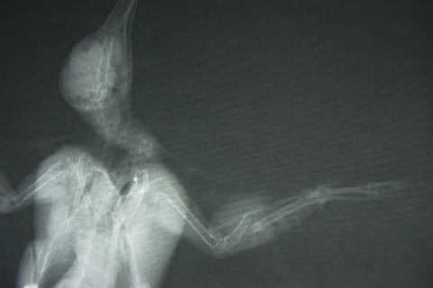厚岸から建物に衝突したヒヨドリが運ばれてきました。レントゲン検査の結果、左の前腕を骨折していました。鳥類では太い方の尺骨は3つに割れ、細い橈骨も根本で脱臼していました。