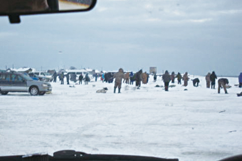 夕方、ポロナイスク北部のポロナイ川河口に出てみると、何やらすごい人だかり!? 冷たい風が絶え間なく吹く、凍てついた河口でいったい何があるというのでしょう?  すっかり結氷しているとはいえ、ここは川の上。こんなに大勢の市民が車で乗り付けても大丈夫なのか。。。少し心配になりました。