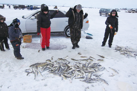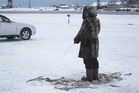 温かそうな毛皮のコートまとったご婦人。足下に散らばる魚の量からして、なかなかの凄腕と見ました。よく聞くと、地元の加工業者がコマイを買い取ってくれるとのこと。。。まさに趣味と実益をかねた季節の催しなのです。