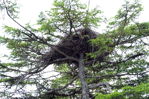 グイマツの頂上に作られたオオワシの巣。厚さ2m直径3m以上に及ぶこともある、巨大な揺りかごです。今回調査を行ったサハリン北東部の潟湖沿岸では、数百ペアものオオワシが繁殖しており、今回調査を行った期間は、まさに子育ての最盛期なのです。
