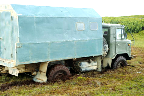 旧ソ連軍払い下げのトラックに乗って、2日がかりでたどり着いたピルトゥン湾のほとり。乾いたツンドラかと思いきや、踏み込んだ先は湿地! 全車輪をぬかるみに取られて車は完全に立ち往生。付近にはウインチの支点となる樹木もなく、途方に暮れるばかり・・・