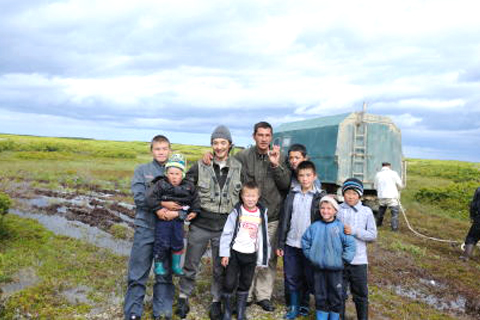夏の間、この地でトナカイを放牧しながら生活しているウイルタ民族の方々が集まってきました。別の大型トラックを呼び、4時間以上も必死で脱出を試みる私達を、手伝ったり冷やかしたり・・・お陰ですっかり仲良しになりました。