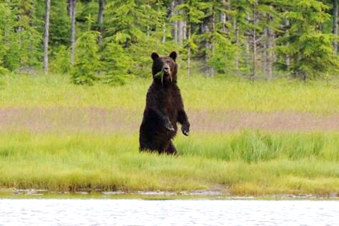 北サハリンで野外生活を行う上で、ヒグマの生活圏にお邪魔していることを決して忘れてはいけません。今回の調査期間中、合計8頭のクマを目にしました。その多くは、カラフトマスの本格的な遡上シーズンを前に、一生懸命草を食んでいる姿でした。