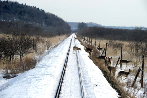 事故に遭った猛禽類の食道や胃からは、未消化のシカ肉が発見される事が多く、列車にひかれたエゾシカの死体を求めてワシが線路内に侵入し、列車と衝突していると考えられました。今回の調査でも、列車の接近を気にする事もなく、線路上を悠々と大群で移動するエゾシカを簡単に目にすることができました。
