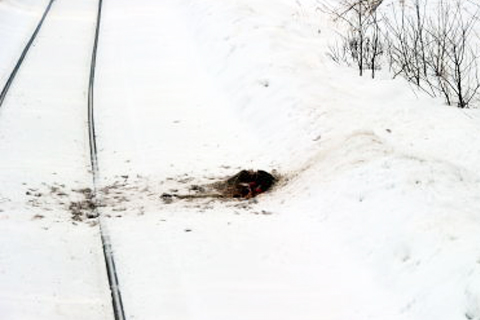 特に雪が深い場所では、雪の無い線路上がエゾシカにとって日常的な移動の経路となっている様子で、線路の上や脇では数多くのシカの轢死体を見ることができました。列車と衝突したシカは、列車の安全な通行のために線路上から除けられているものの、多くは線路のすぐ脇に放置されている様子でした。