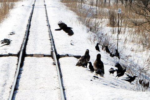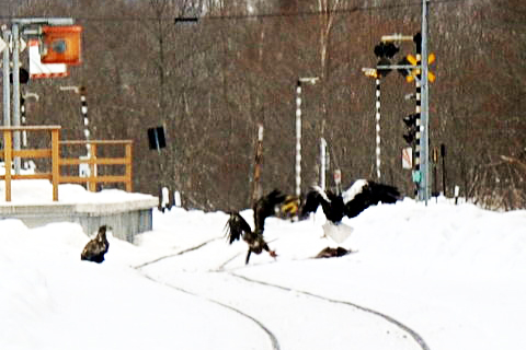 ワシの列車事故は人里離れた場所だけで発生しているわけではありません。この写真のように、駅のプラットホームから近い場所でも、エゾシカの死体に群がるオオワシとオジロワシの姿を観ることができました。
