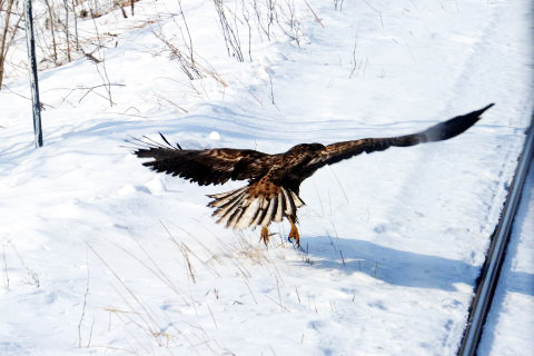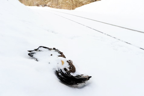 この鳥のように、雪で隠されてしまったり、動物に食べられたりして、回収されず消失してしまっている被害鳥も数多く存在すると思われます。ワシの列車事故を防ぐため、餌となるシカの轢死体を確実かつ速やかに線路の近くから撤去する仕組み作りが急がれます。