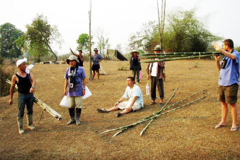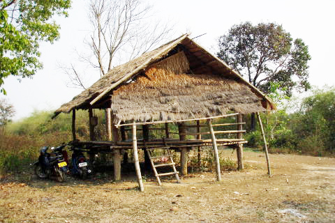 調査のベースキャンプとして、現地の人が池で魚を採ったりする時に使われる作業小屋をお借りしました。実はラオスは私達が訪れた月は暑季の始まりで、30℃を超える日々でした。ガイドブックなどで事前に暑いとの知識はあっても、実際に40℃近くの気温は…体が北海道仕様の私にはとてもつらい暑さでした。高床式の小屋は風通しが良く、理にかなった仕組みです。