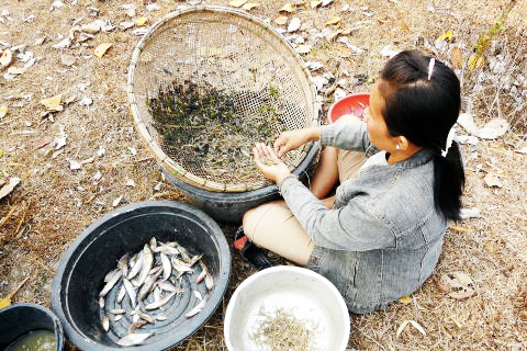 調査中、池で漁をして獲れた魚やエビを仕分けていた現地の人に出会いました。ラオスはミャンマー、タイ、カンボジア、ベトナム、中国に囲まれ、海が無い国です。こうした河川や池での淡水漁業が主要な生業だそうです。