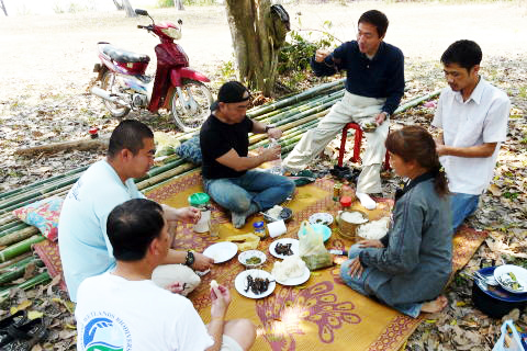 調査の合間を見て、マーケットで買ってきた色々な食べ物にチャレンジです。ラオスではもち米が主食で、竹で編んだ器から蒸したもち米を手でひとつまみ取り、おかずをつまんで一緒に食べます。暑い気候のせいか、辛いものが多いかもしれません。現地の人は、池で取れるタガメやゲンゴロウなどもおかずとしていました。