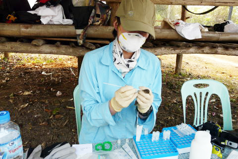 捕獲した鳥達は暑さで弱ってしまわないよう細心の注意を払いました。記録を取る、健康状態の把握のため体重などの計測をする、そしてサンプルを採取するといった作業を分担してすばやく行いました。採取したサンプルは、ラオスの獣医当局と日本の検査機関で分析が進められる予定です。