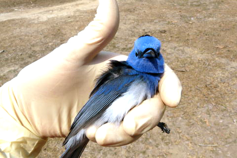 小鳥や水鳥を狙って調査を行いました。今回は暑い中、本当に大変な作業でしたが、なんとか100羽以上のサンプルを採取できました。捕獲した中には、日本では出会えない鳥もいて珍しさに胸が躍ります。写真は、クロエリヒタキの雄です。鮮やかなブルーに目を見張るばかりです。