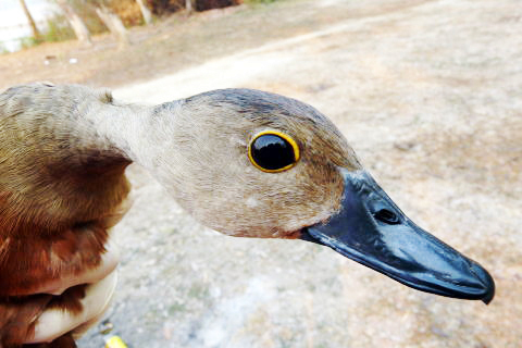 渡りの研究のため衛星発信機を装着するカモの捕獲も目的の一つだったのですが、やはり簡単には捕まらなくて…調査も後半に差しかかった頃、ようやく1羽のカモが捕獲されました。写真のリュウキュウガモです。しかしリュウキュウガモは留鳥で、複数の国を渡ることがないことから今回は発信機を装着しませんでした。今後の調査で渡り性のカモに装着できる日が来るまで、発信機はお預けです。