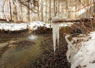 シマフクロウのリハビリケージ内の池に氷柱ができていました。