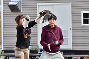 作製したジェスをチゴハヤブサに付け、センター前の広場でラインフライトを行いました。