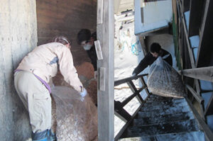 詰め終わったら、2階の作業部屋から袋を下して軽トラックに詰みます。