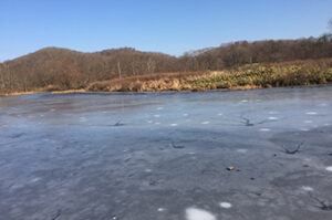 先日、釧路もついに初雪を迎え、裏手の池も氷で覆われました。