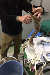 この子は右脚を骨折してしまい、まだ自立することが出来ない為、骨が接合するまでツル用ハンモックに乗った状態で入院しています。