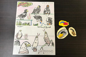 塗り絵は翼の無いワシや、感電対策器具のバードチェッカーの色塗りをしてもらうことで、研究所で終生飼育しているワシや、感電対策の試みを知ってもらいたいと思い、写真を見せたりお話を聞いてもらいながら塗ってもらいました。