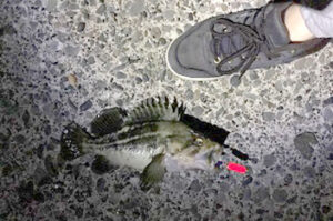 釣れました!ようやく一匹目の「クロソイ」をゲットしました。その後、さらにウグイを一匹釣り、この日の成果は合計二匹でした。初めてだったので釣れただけでも大満足で、楽しい釣りになりました。これで飼育している子達にもお土産を持って帰れます。