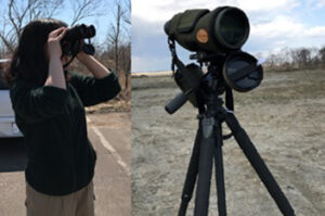 さて、今回は調査を行う上でとても重要となる道具を紹介したいと思います。まずは、双眼鏡とプロミナ(望遠鏡)。この2つは遠くにいる鳥を識別、記録する上でとても重要になります。プロミナの接眼部分にケータイのカメラを近づけて鳥を撮影したりもします。