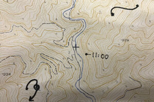 そして、鳥の行動を記録するうえで重要なのは地形図です。見つけた鳥の飛翔ルートや行動を地形図上に書き込みます。写真の◎は旋回飛翔といって空中で円を描くように回る飛び方を表します。 ※地図および飛翔記録はダミーです