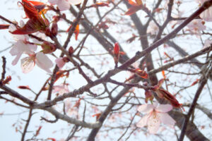 待ちくたびれて、忘れたころに咲いていました!こちらはセンターの山桜(5.15撮影)関東ではソメイヨシノが主流ですが、北海道は山桜のほうが多いのだとか。開花と同時に赤い葉も芽吹くのが山桜の特徴ですね。八重桜や枝垂れ桜などと同じく、ソメイヨシノよりも平均開花日が遅いのも特徴。それにしても、長いこと待ちました。