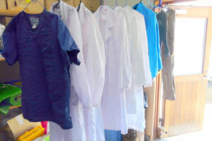 傷病鳥の治療とリハビリだけがセンターの仕事ではありません。既に死亡して運び込まれたものや、治療したものの残念ながら死んでしまった個体などは解剖を行います。死亡原因を突き止めることで、根本にある問題点を解明し、今後につなげていくためです。前置きが長くなりましたが、解剖が立て続けにあった日は洗い物もたくさん!天気のいい日には術着と白衣が気持ちよく翻っています。
