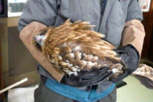 「うずくまって動かなかった」からと運ばれてきました。視診では外傷も骨折も確認できませんでした。トビは死んだふりをするので擬傷が疑われましたが、念のためにレントゲンを撮り確認すると右の烏口骨が折れていました。