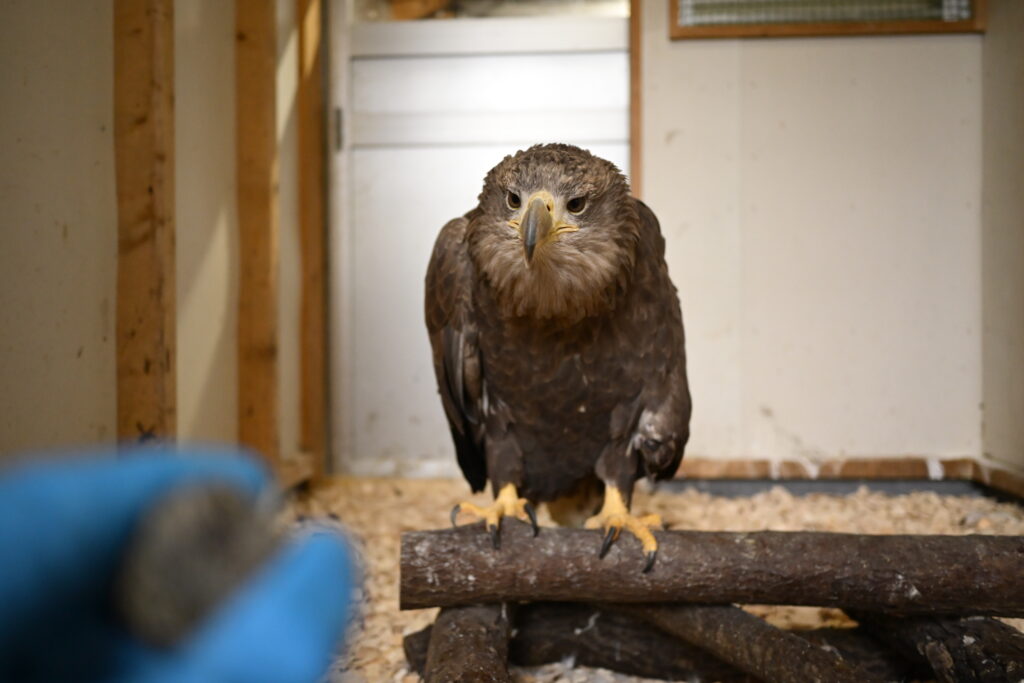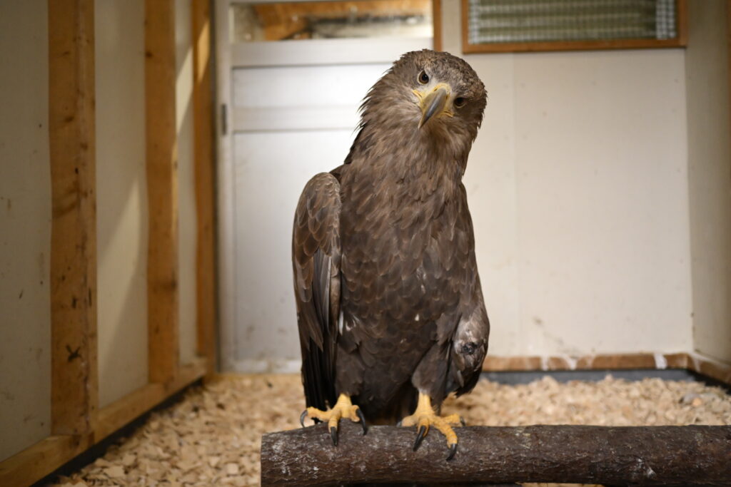 オジロワシの「友ちゃん」は、ヒナの時に何らかの理由で巣から落下し、その際に肘関節を損傷した影響で飛ぶことが出来ません。