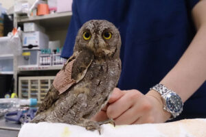 今回救護されたコノハズクのレントゲン写真を撮影したところ、この個体は右の尺骨が骨折していることが分かりました。人の腕にも肘より先には橈骨と尺骨という2本の骨が平行にあります。幸いなことにこの個体では橈骨は折れていなかったため、大掛かりな手術はせず、外から翼を固めることで骨折治療を行いました。骨折した骨が無事付けば、野生復帰を目指してリハビリをしていく予定です。