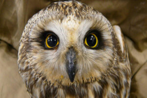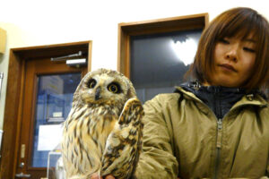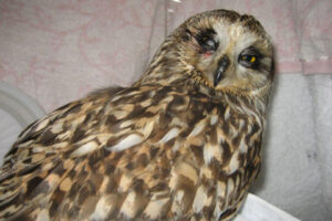 右目の周りから出血し、意識が朦朧(もうろう)としたコミミズクが運ばれてきました。人が触ってもほとんど反応がなく、痛めた方の目は見えていないようです。翼や足の骨折はないものの、頭部を強打しており、脳の損傷が心配されました