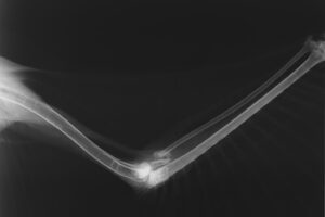 早速レントゲン検査を行ったところ、左翼の橈骨(とうこつ)と尺骨を骨折し、肘を脱臼している事がわかりました。全身麻酔をかけて関節の状態を検査したところ、幸い重要な腱や筋肉に大きな損傷はありませんでしたが、骨折した骨がすでに不整癒合しかけていました。その状況から、今回は手術によって外科的に整復する事を避け、運動制限とリハビリテーションで飛翔力の回復を試みることにしました。