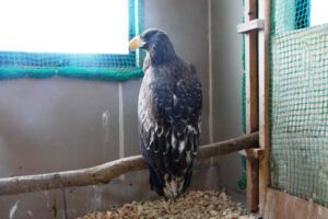 上川地方の山中で、衰弱したオオワシの幼鳥が収容され、苫小牧のウトナイ湖鳥獣保護センターに運び込まれました。広めのケージの中に入れて半月ほど様子をみていたものの、なかなか高いとまり木に上がることができないとのことで、精密検査や治療、リハビリテーションを私達のところで引き受けることになりました。苫小牧から釧路まで約300kmの道程。途中には雪深い日高山脈があります。吹雪の中、8時間かけて慎重に釧路湿原野生生物保護センターにオオワシを運び込みました。