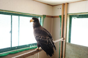 オオワシはれっきとした冬鳥。遅くとも、最後の若鳥たちが渡去する5月中に放鳥できなければ、ケージの中で来シーズンを待たなくてはなりません。限られたスペースの中で、その時々に必要なリハビリを進めて行くことが大事です。入院から数日後、肘関節が固まって開かなくなってしまことを防ぐため、長時間羽ばたくことなく翼を広げさせるよう促すことにしました。鳥の状態を観ながら、とまり木の位置を少しだけ高くするのですが、そのさじ加減は、オオワシの気持ち酌みとることが大切。長年の経験と勘だけが頼りです。