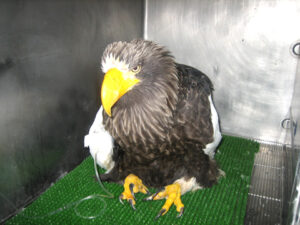 2011年暮れ、道東の浦幌町と鶴居村から衰弱したオオワシとオジロワシが立て続けにセンターに運び込まれました。血液中の鉛濃度を測ったところ、検査機器の計測限界を超えるほどの高い値を示し、重度の鉛中毒症と診断されました。ただちに点滴などで解毒剤を投与しましたが、残念ながら2羽とも翌朝までに死亡してしまいました。死亡したワシの胃からエゾシカの体毛と鉛片が発見されたことから、狩猟で撃たれたシカの死体をワシが食べ、肉などに含まれる鉛ライフル弾の破片を飲み込んで鉛中毒に陥ったと考えられました。 (写真:2011年末に収容された鉛中毒のオオワシ)