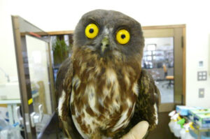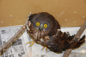 「フクロウ」とのお話だったので、エゾフクロウを想像しながら待ち合わせ場所に向かいましたが、いざ対面してみると、ずっと小さくて黄色い眼が特徴的なアオバズクでした。元気はあるものの、左側の翼が骨折していることがすぐに解りました。発見現場は交通量も多く、車と衝突したのかもしれません。協力いただいた方にお礼を言い、すぐにセンターに運びました。