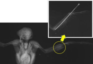 レントゲン検査の結果、左翼の「尺骨」という骨に、骨折が認められました。体重がわずか180gしかない非常に小さな体のため、あまり重い固定器具を使うことはできません。今回は脊髄麻酔用の特殊な注射針を、骨を固定するピンに改造して利用しました。
