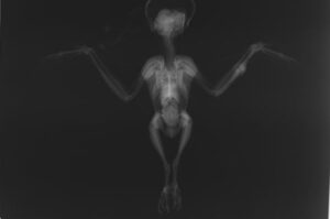 ピンを入れた骨が完全に付くまで、翼はテーピングでしっかりと固定します。しばらくは狭いケージの中で我慢の日々を過ごしてもらいました。オペを行ってから18日後、レントゲン検査の結果、骨折していた骨が癒合していることが確認されました。もう固定具は必要ありません。ピンを抜き、飛翔訓練の始まりです。