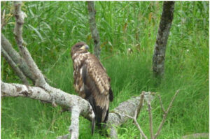 カヌーガイドさん達が最初に見つけた場所に幼鳥はとまっていました。近くで親ワシの警戒する声がします。幼鳥はなかなか親鳥に反応せず、ようやく発した声も非常に弱々しいものでした。この時期の幼鳥はまだ自分で餌を取ることができす、飛び方もあまり上手くありません。人が近づいても、全く逃げる素振りを見せず、地面に近い木の枝にとまり続けていることから、普通の状態ではないことはすぐにわかりました。
