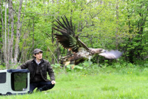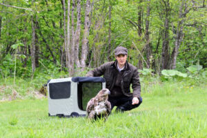 輸送用のキャリーケージから飛び出した若ワシは、いったん柔らかい草の上に立ち止まり、ゆっくりと辺りを見渡した後、意を決したように飛び立ちました。力強い羽ばたきは、長期間に及んだリハビリの賜物でしょう。