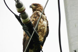 ただ・・・数日後にワシがとまっていたのは感電する可能性がある電線の上。高い場所を好む猛禽類は、電柱や電線をとまり場として多用するため、これまで電力会社などと協力しながら、様々な感電防止器具を電柱上に設置してきました。今回も情報を関係各所と共有し、早急に対策をお願いすることにしました。