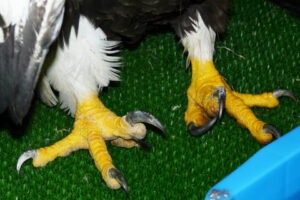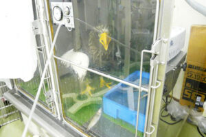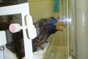 オオワシはかろうじて起立しているものの、足指が正常の姿勢を保てず、麻痺しているようです。身体に取り込まれた鉛は、赤血球の寿命を短縮するとともに、新しい血液の産生をも阻害してしまうことから、重度の貧血に陥っていました。呼吸が苦しそうなため、直ちにICUの中に収容し、酸素を供給します。しばらく餌を食べることができなかったらしく、とても痩せていました。