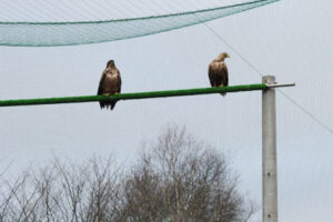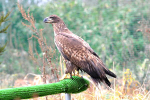 野生生物保護センター最大のフライングケージの中で、この冬の野生復帰に向けて、2羽のオジロワシが最終段階のリハビリに励んでいます。今年4月に感電事故に遭い入院生活を送ってきた成鳥(全身大やけど)と、8月に巣立ちに失敗して保護された幼鳥(顔つきも凛々しく)です。