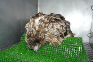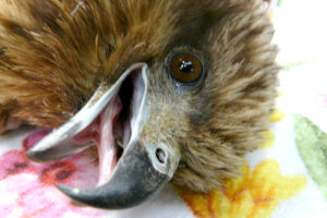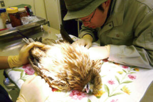 鉛の解毒剤を投与するために、診察台の上に寝かされたトビ。トビは、よく「死んだふり」をします。人に捕まった時など、身の危険を感じると頭を下げてうずくまったまま。。。ひっくり返ったまま微動だにしないものもいます。本当に調子が悪いのか、それともタヌキ寝入りなのか?見極めるためには、わずかな目の動きや呼吸の有無などの観察ポイントが重要です。